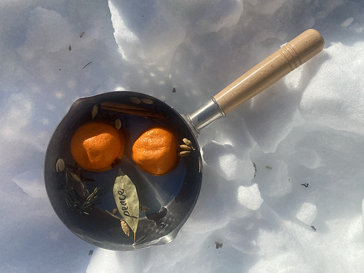 Wash the oranges and put them, along with the spices, in a pan with enough water to cover. Bring to a boil and then lower to medium heat and keep at a low boil. (Just boiling, which is higher than you would usually leave a simmer pot, but you want to cook the oranges.) Cook uncovered for 1½ – 2 hours adding more water if it begins to get low.