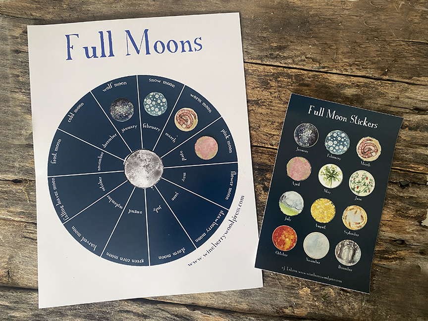 More about full moon names: Each moon represents a month of the year and one of the traditional full moon names. These names vary substantially depending on region and phenology. Read more about the history of the specific names I have chosen for each month as well as full moon crafts, activities and recipes here.