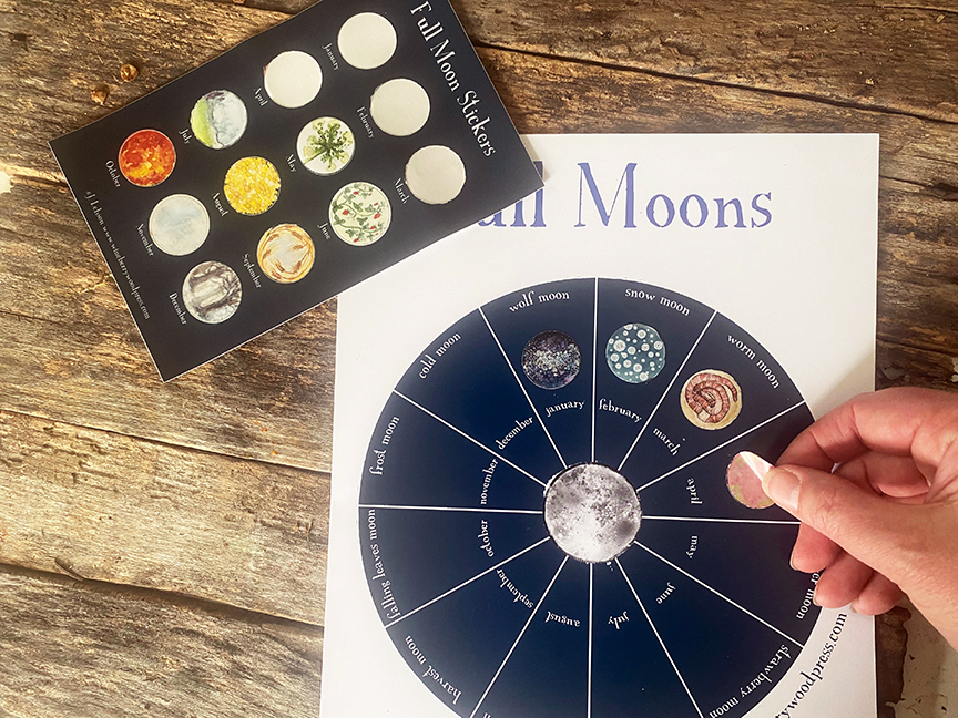 Keep track of each full moon of the year with this fun print and sticker set! The art print is a blank lunar wheel with the name of each moon and the month in which it occurs. As each moon occurs you can add the corresponding sticker from the sheet. You can start this activity in any month! Perfect for kids, grown ups and anyone who likes to keep an eye on the moon.