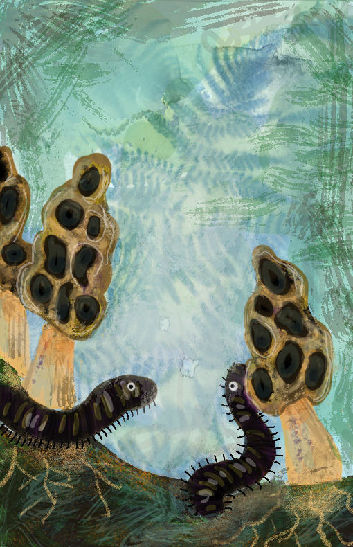 Jessie Lehson, 2025, digital media and anythotype. Fern anthotype Ferns, morel mushrooms and centipedes (all of which grow symbiotically.)